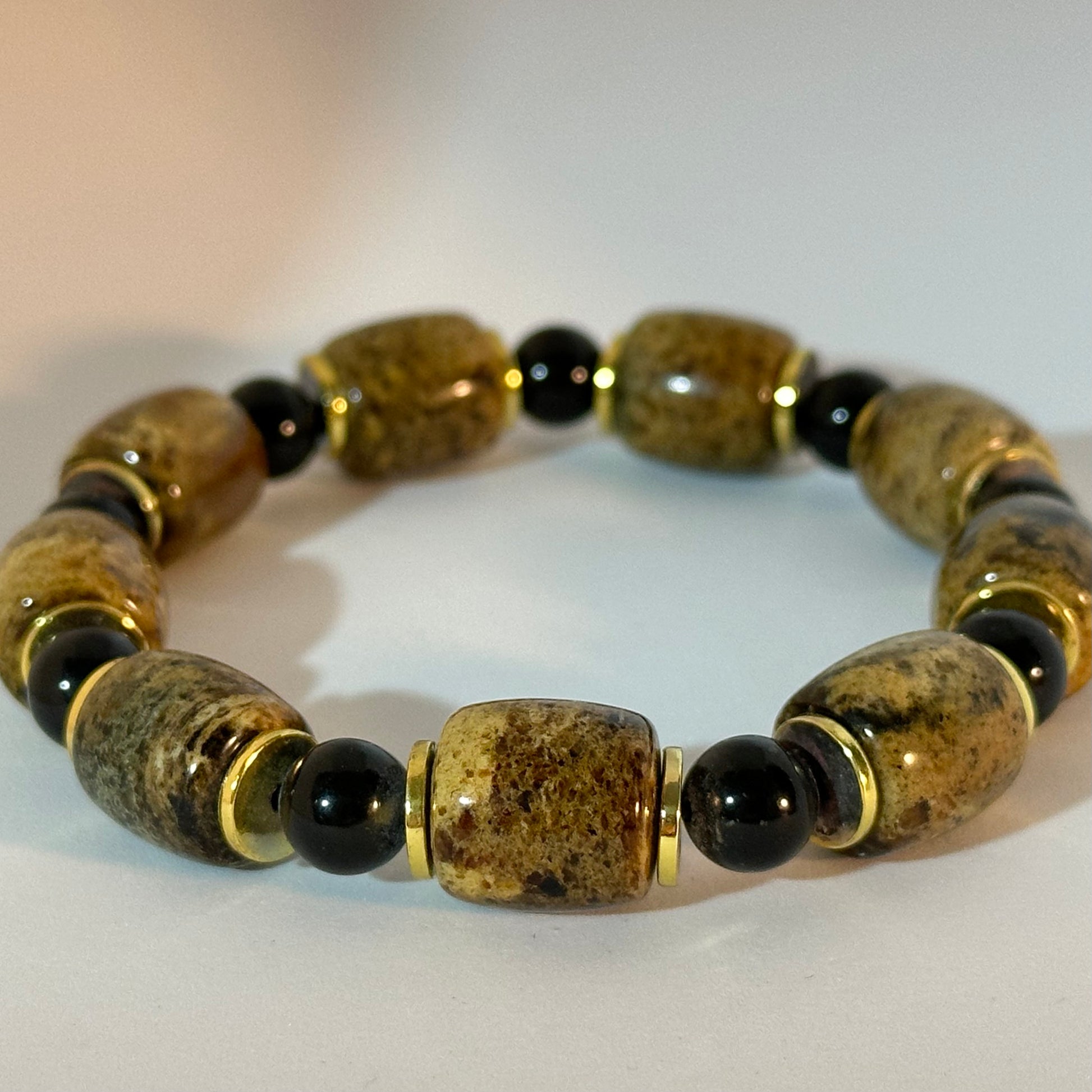 The Ancient Charm Amber Bracelet is a bold and distinctive piece, combining the warm glow of amber with striking black beads and luxurious gold accents. Its unconventional design exudes strength and individuality, standing out as a true statement accessory. Infused with the spirit of ancient cultures, this bracelet carries a sense of history and mystery, making it perfect for those who appreciate unique, meaningful jewelry with character and depth.