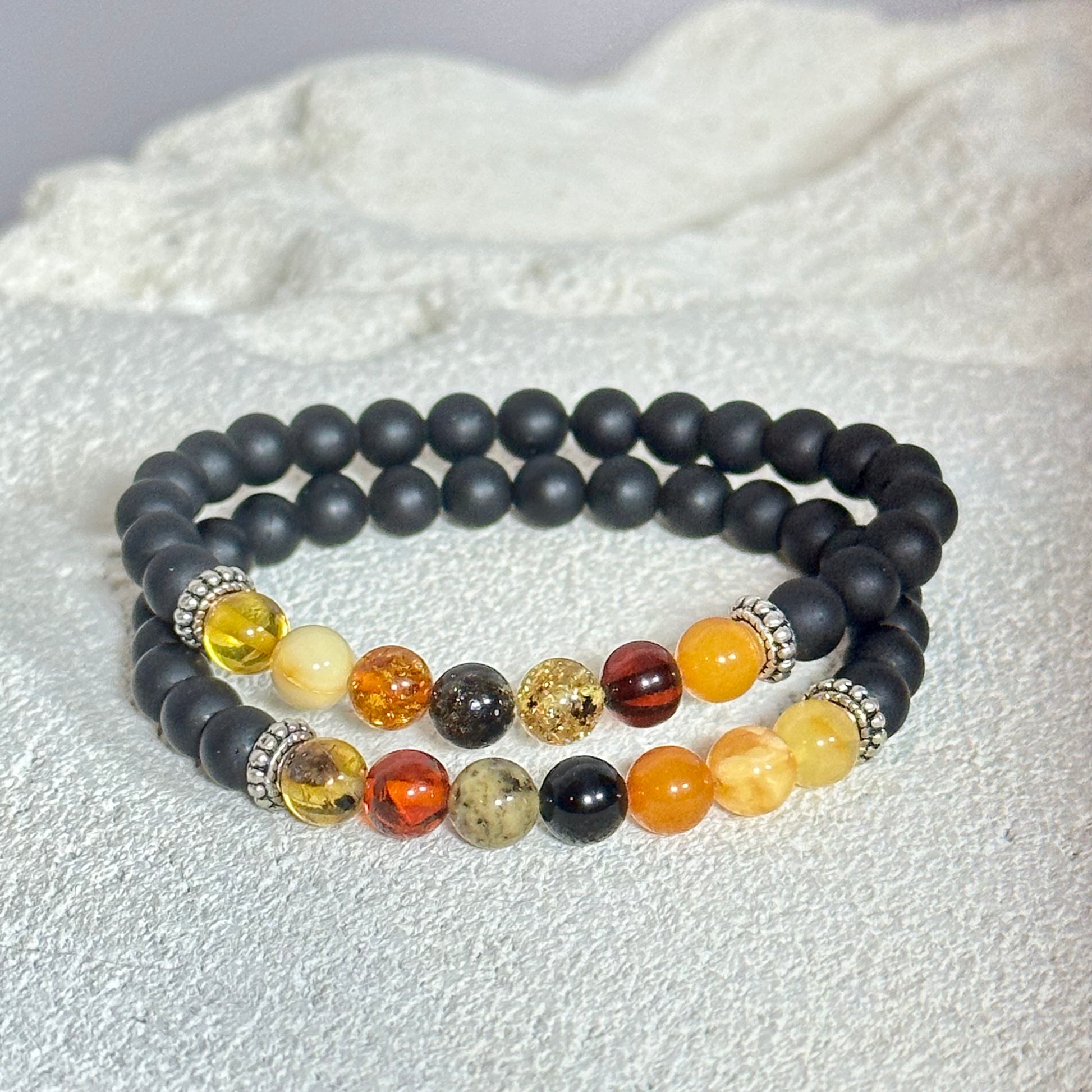 The Playful Amber Bracelet combines sleek dark with a vibrant section of colorful amber stones. The contrast between the dark beads and the warm, lively amber hues creates a fun and dynamic look. This bracelet is perfect for adding a touch of color and personality to your everyday style while maintaining a modern and versatile appeal.
