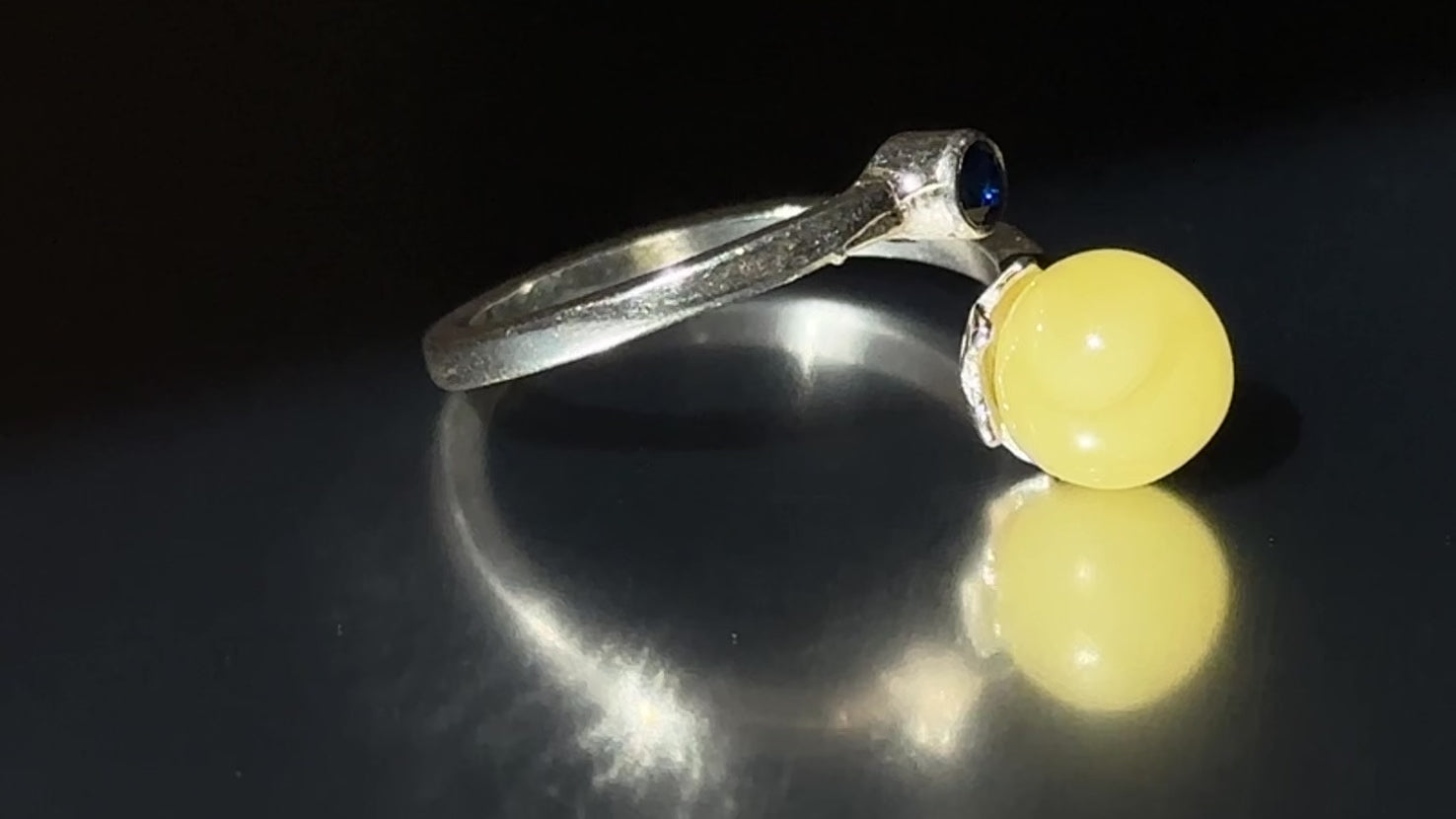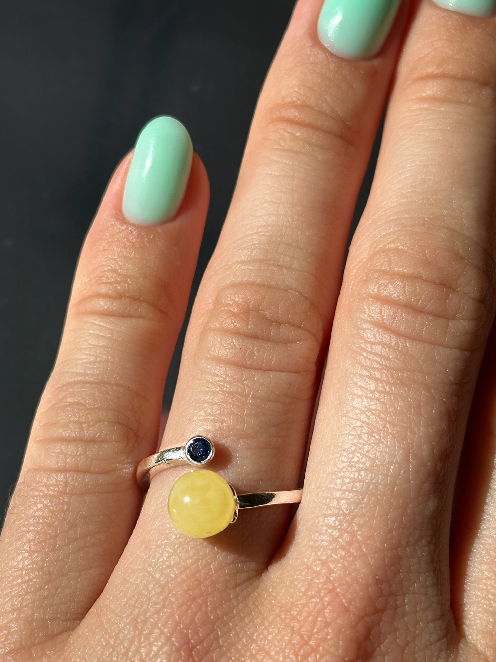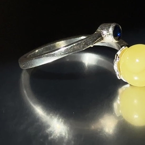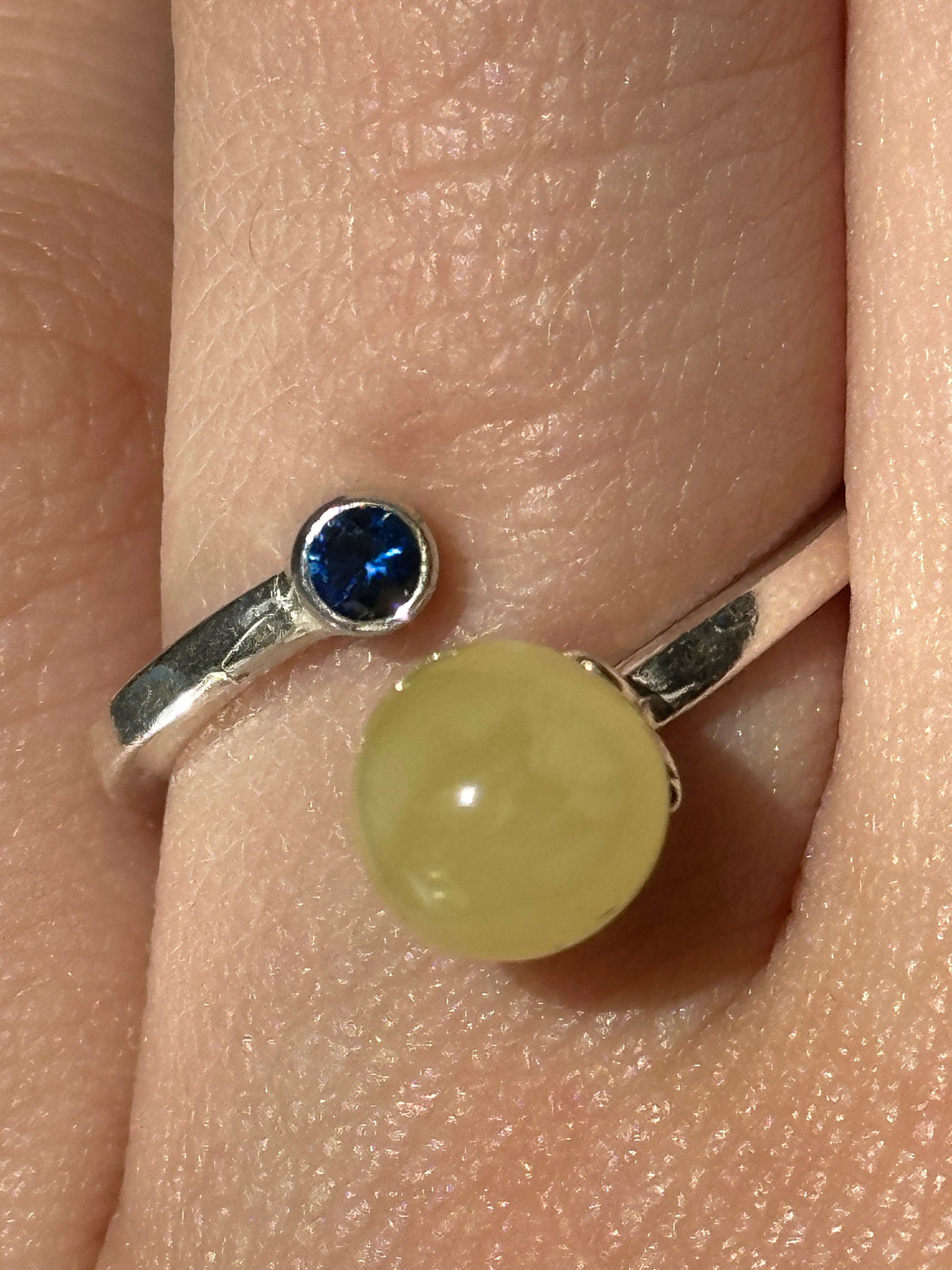 Bold yet balanced, this adjustable sterling silver ring features creamy white amber paired with a deep blue accent stone. The striking contrast evokes sky and cloud, calm and clarity — a unique statement of harmony and individuality.