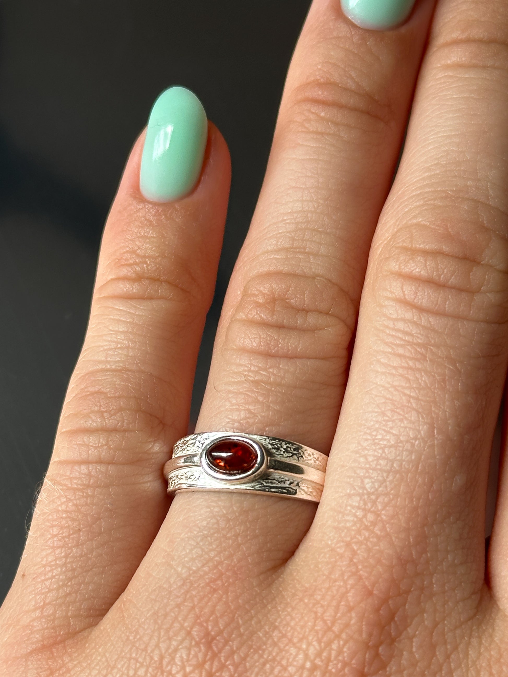 Delicate and timeless, this sterling silver ring features a warm cognac amber — a natural gem glowing with golden depth and character. Lightweight yet distinctive, it’s perfect for everyday elegance or a subtle statement.