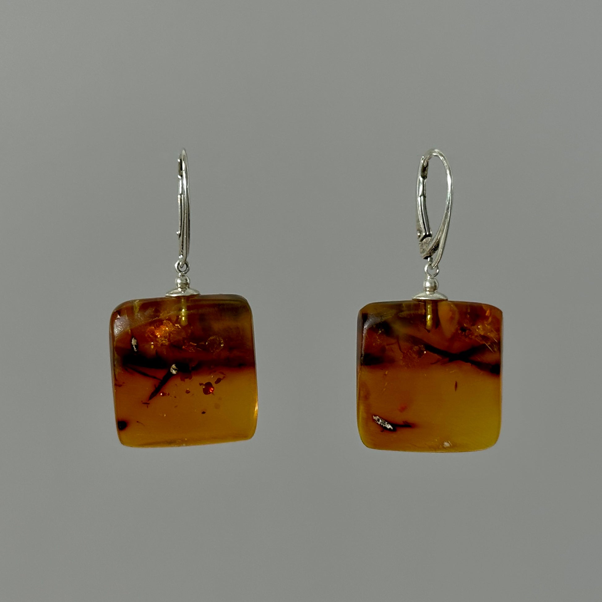 These square-shaped amber earrings blend warm browns and yellows with subtle black accents, evoking the allure of a golden sea bottom. The intriguing combination of colors creates a mysterious, yet elegant vibe.