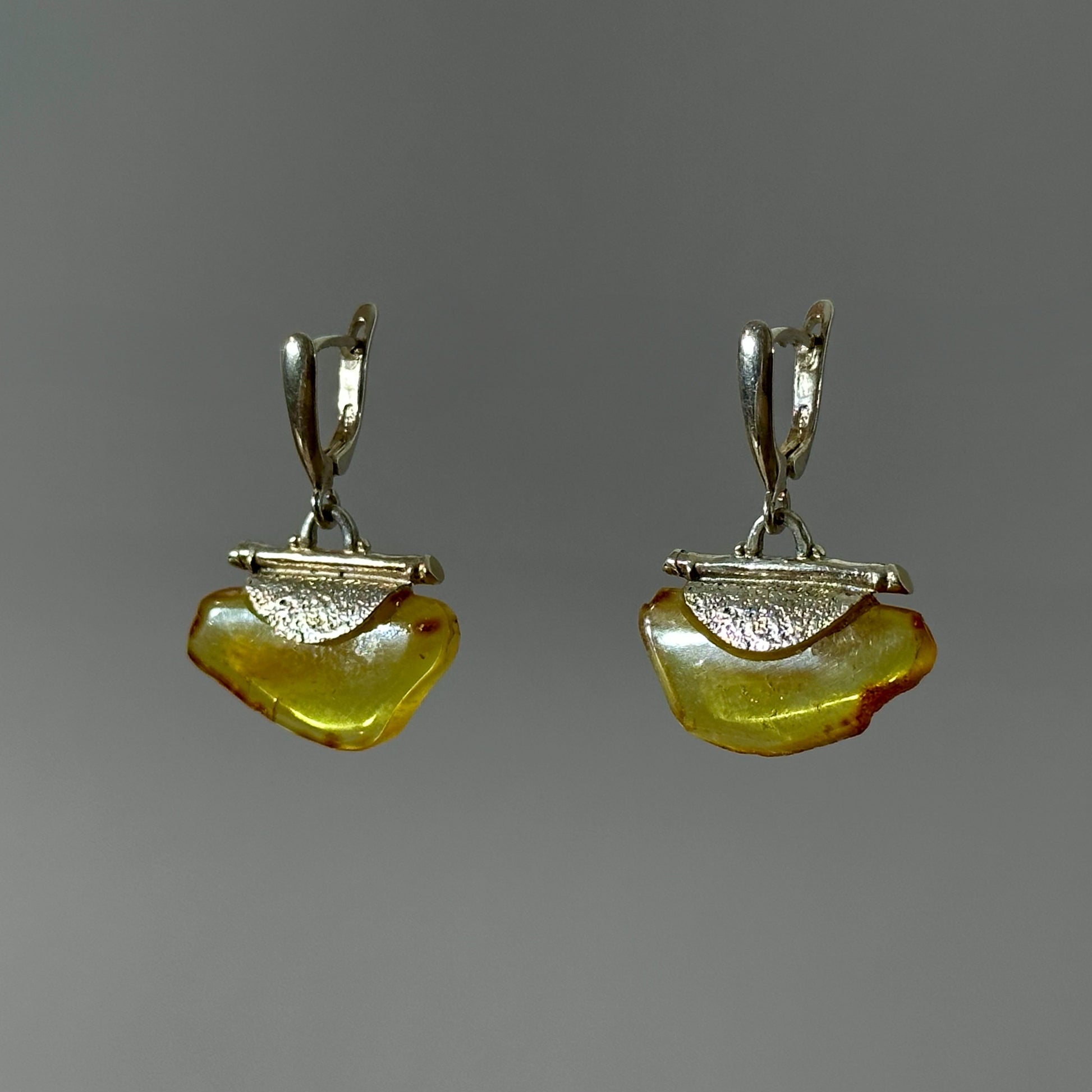 These yellow amber earrings feature a subtle play of water-like swirls within the amber, creating a fluid, dynamic effect. Paired with sleek silver accents, they offer a minimalist yet striking design, radiating strength and effortless elegance.