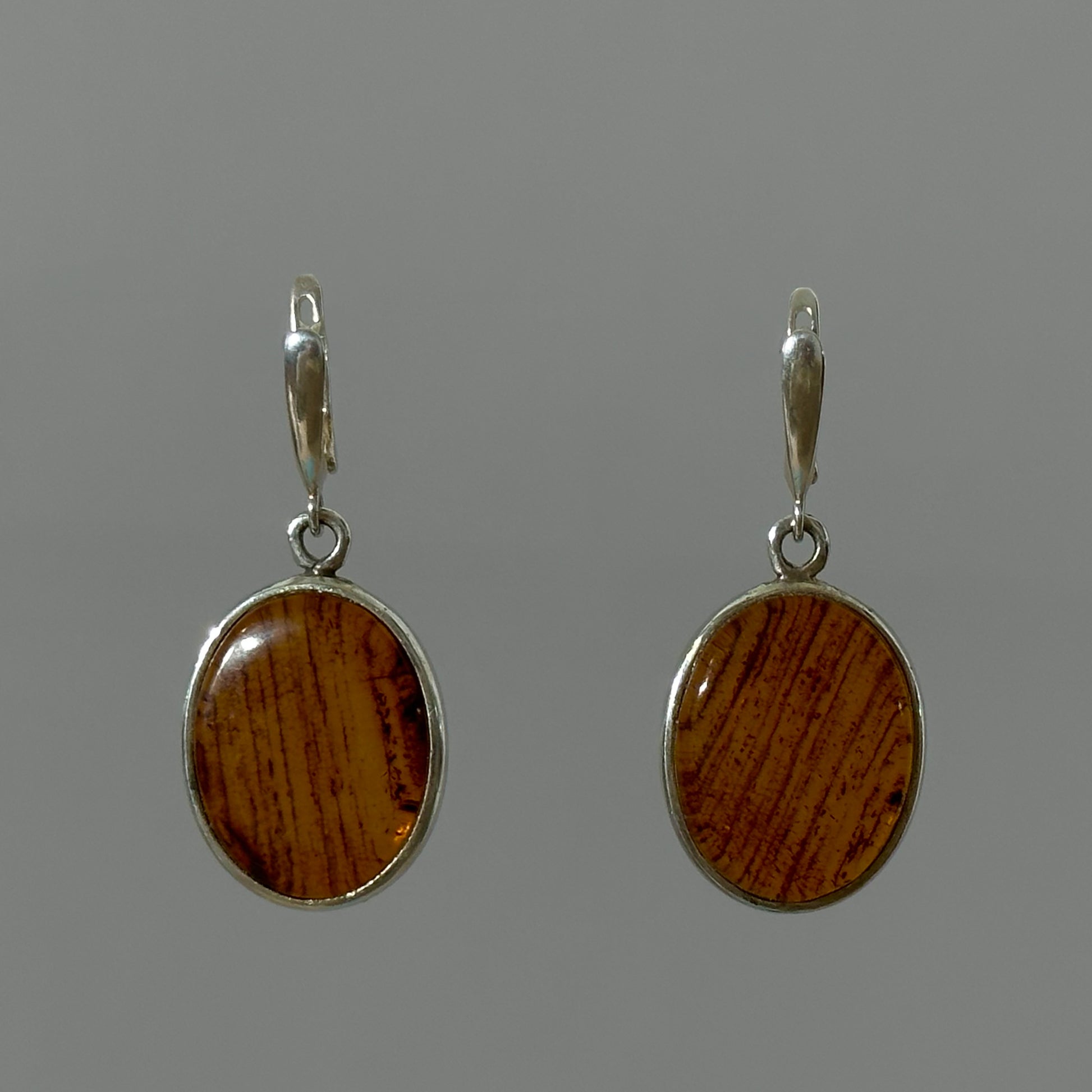 These oval brown amber earrings, featuring striking dark brown stripes, mimic the natural beauty of wood grain, evoking a serene, earthy vibe. Their organic design brings a calming, nature-inspired touch to your look, perfect for adding understated elegance and tranquility.