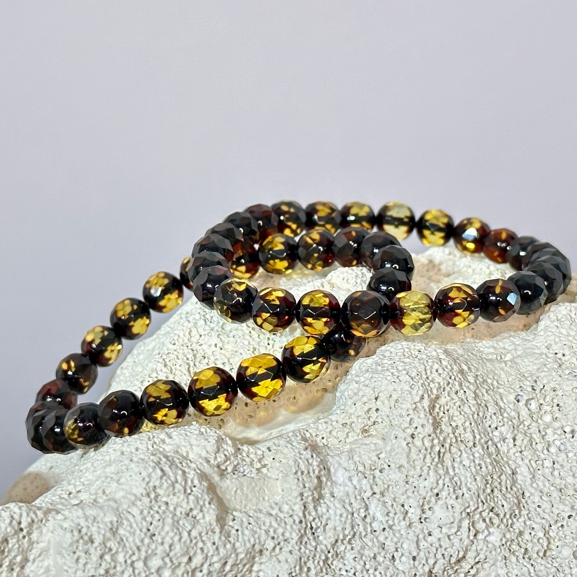 This bracelet features perfectly round green amber beads, each expertly faceted to create a dazzling, diamond-like effect. The intricate angles on each bead catch and reflect light, adding a sophisticated sparkle to this elegant piece. Its harmonious design and luxurious appearance make it a standout accessory, perfect for elevating any outfit with a touch of refined brilliance.