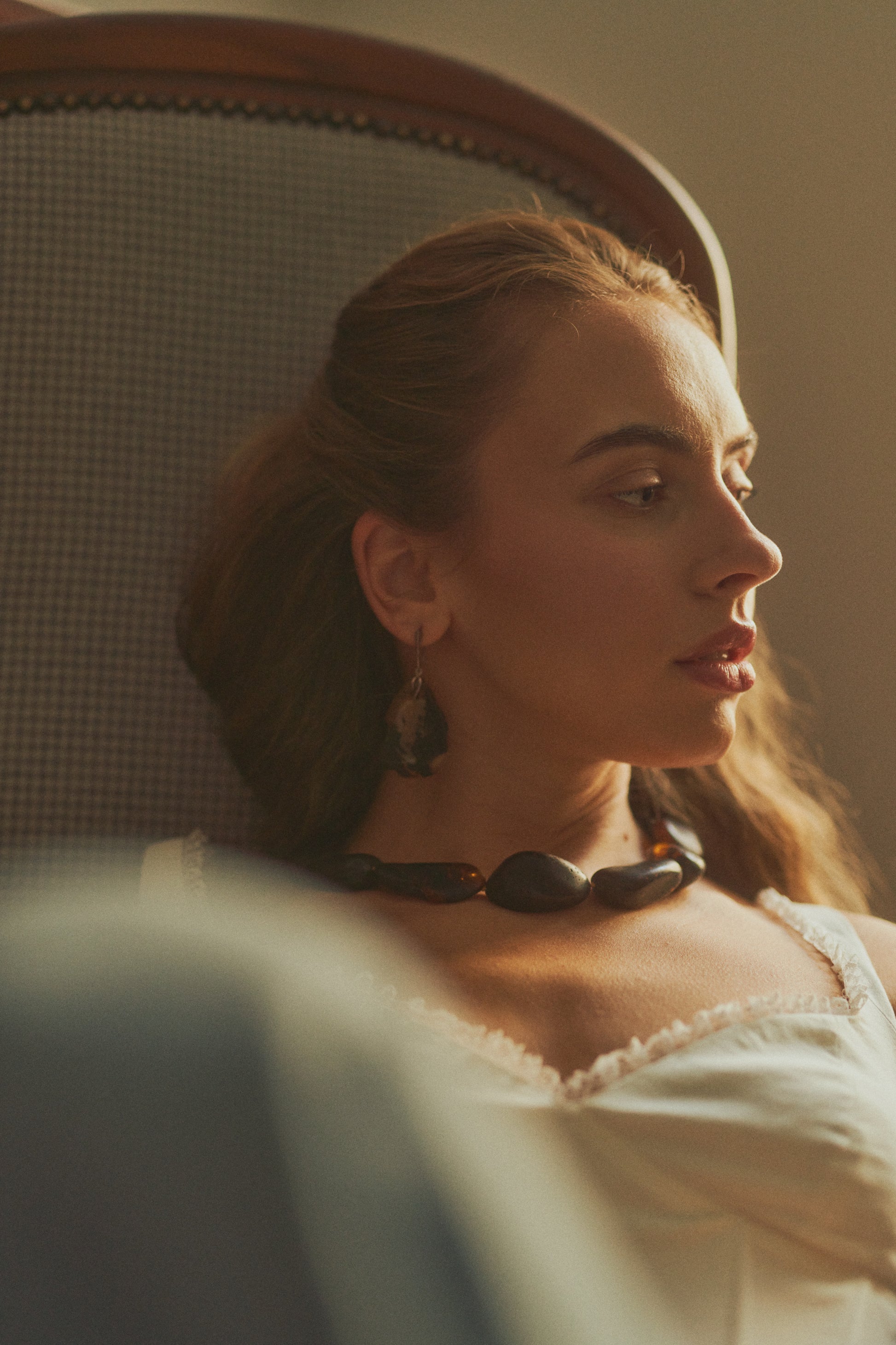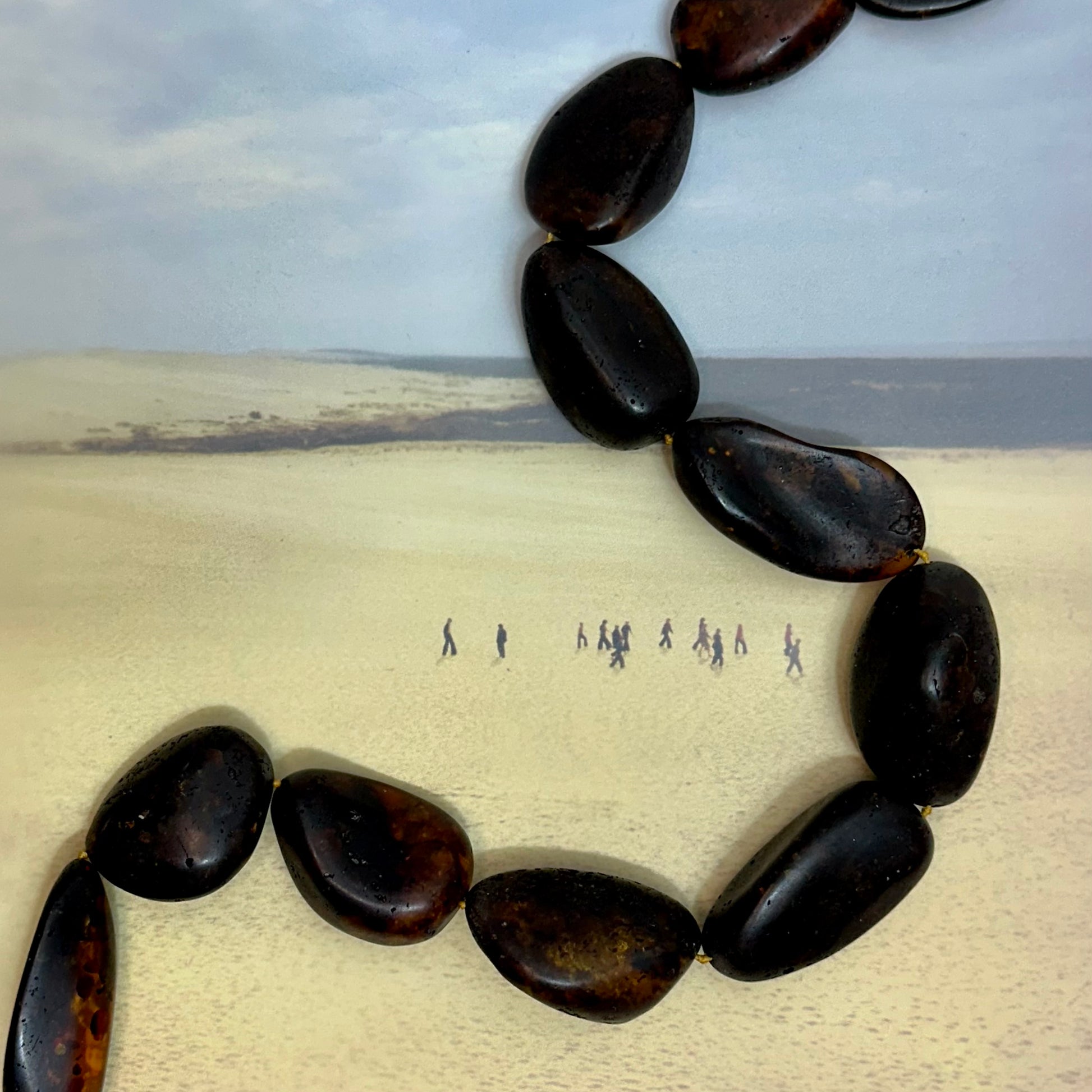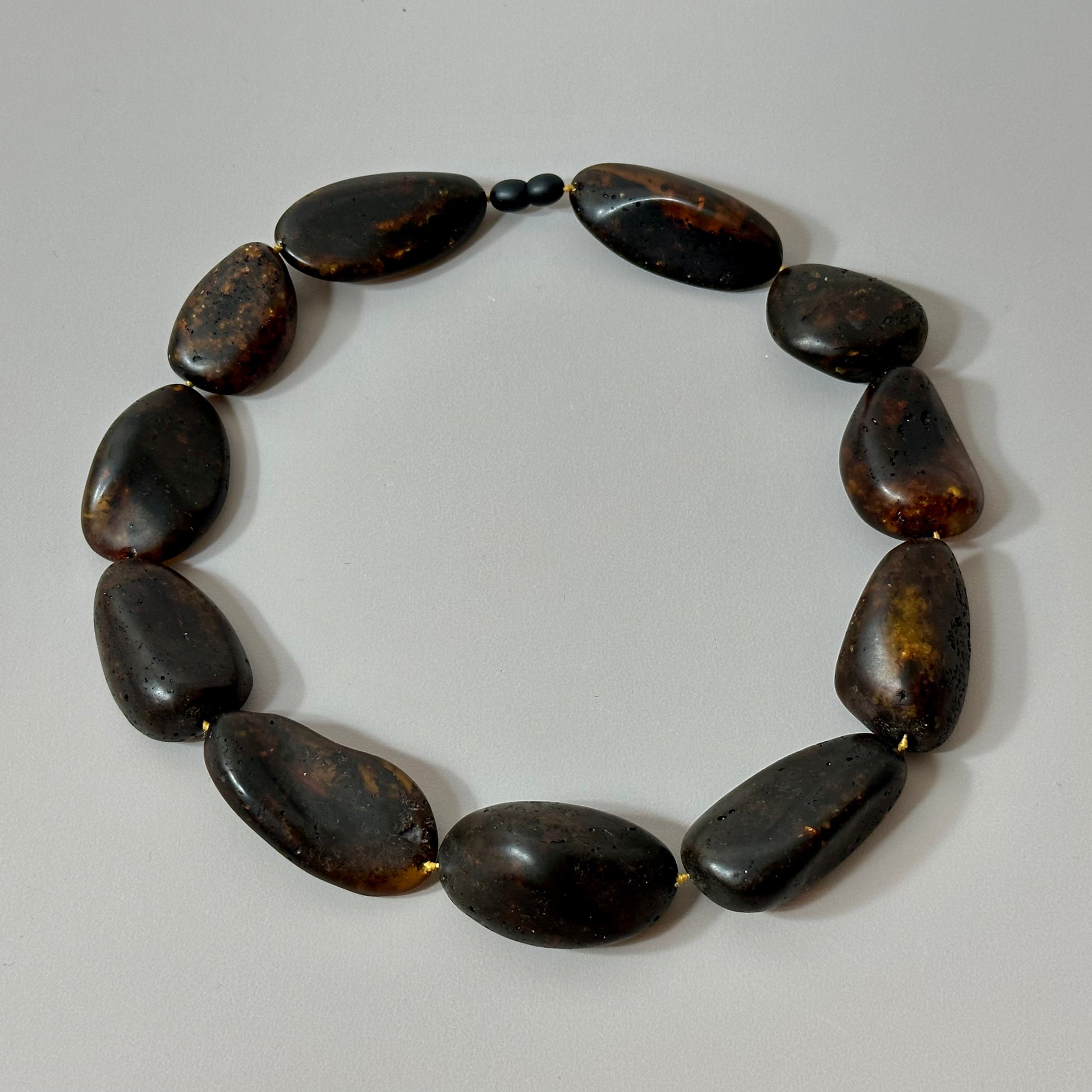 This deep cognac amber necklace is a true treasure—an extraordinary piece with a matte exterior that hides subtle shimmering details within. Its mysterious allure sets it apart, as it doesn’t immediately reveal its amber origins, making it an intriguing and bold accessory. A once-in-a-lifetime find, this necklace is perfect for those who embrace daring, unique style with a touch of spice.