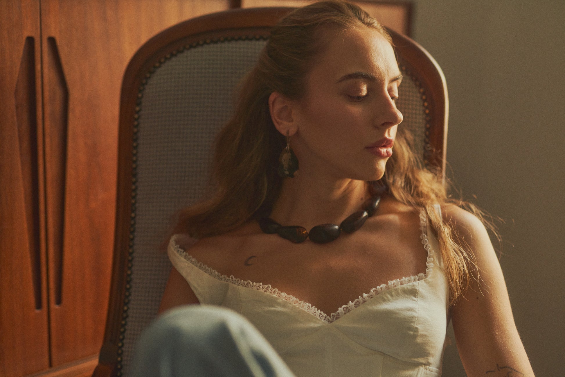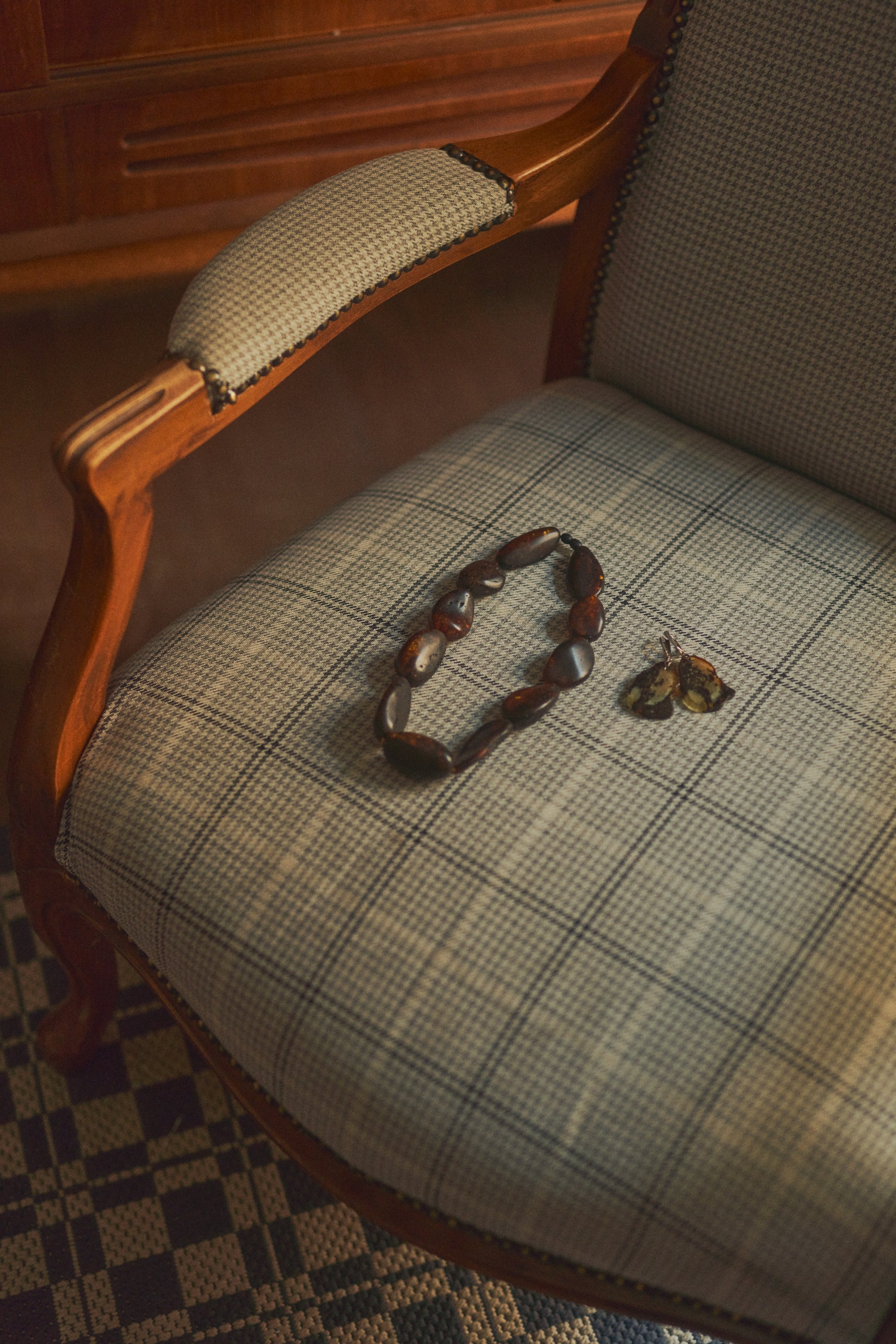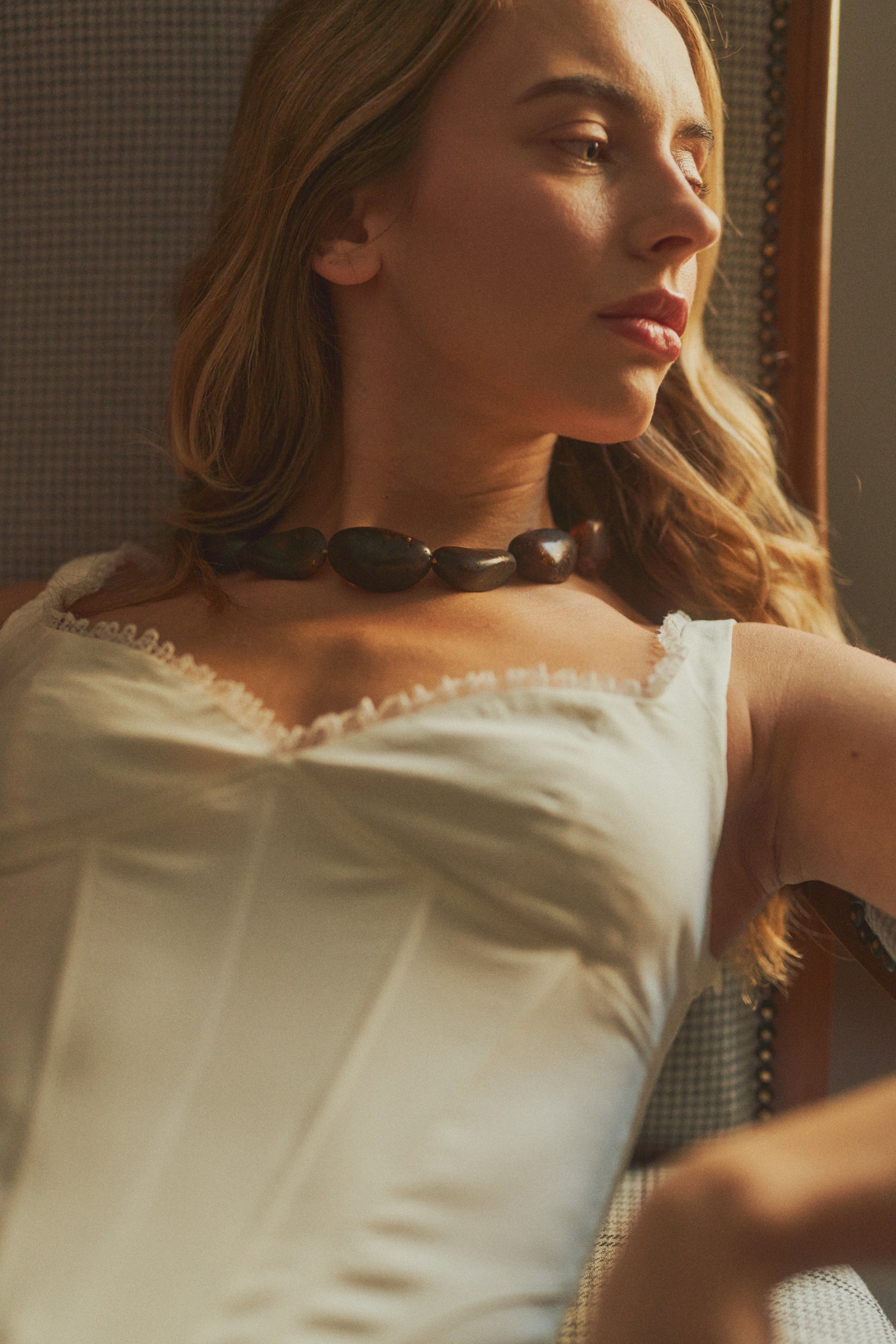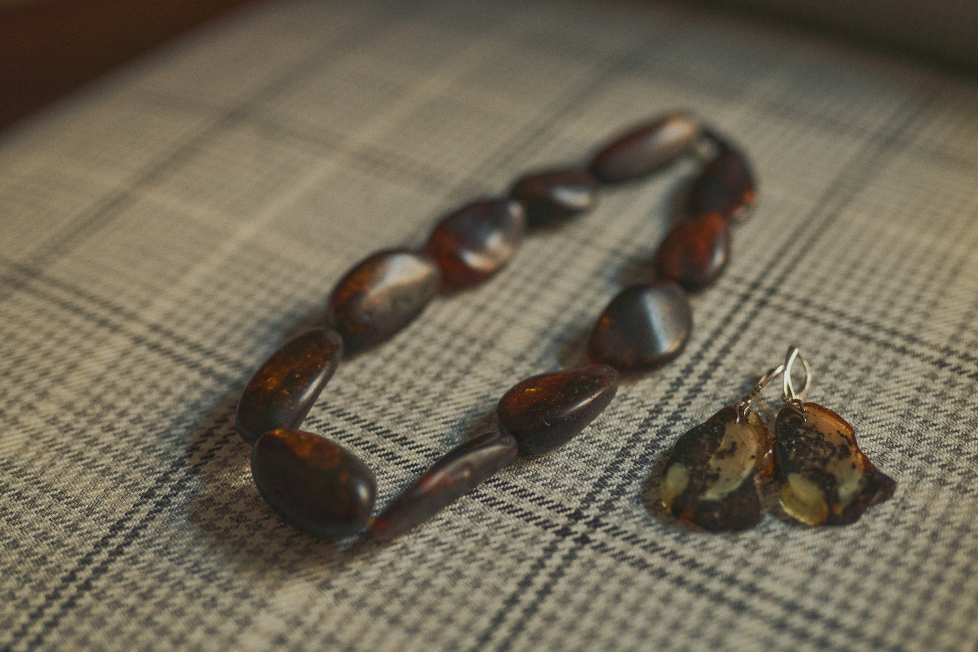 This deep cognac amber necklace is a true treasure—an extraordinary piece with a matte exterior that hides subtle shimmering details within. Its mysterious allure sets it apart, as it doesn’t immediately reveal its amber origins, making it an intriguing and bold accessory. A once-in-a-lifetime find, this necklace is perfect for those who embrace daring, unique style with a touch of spice.