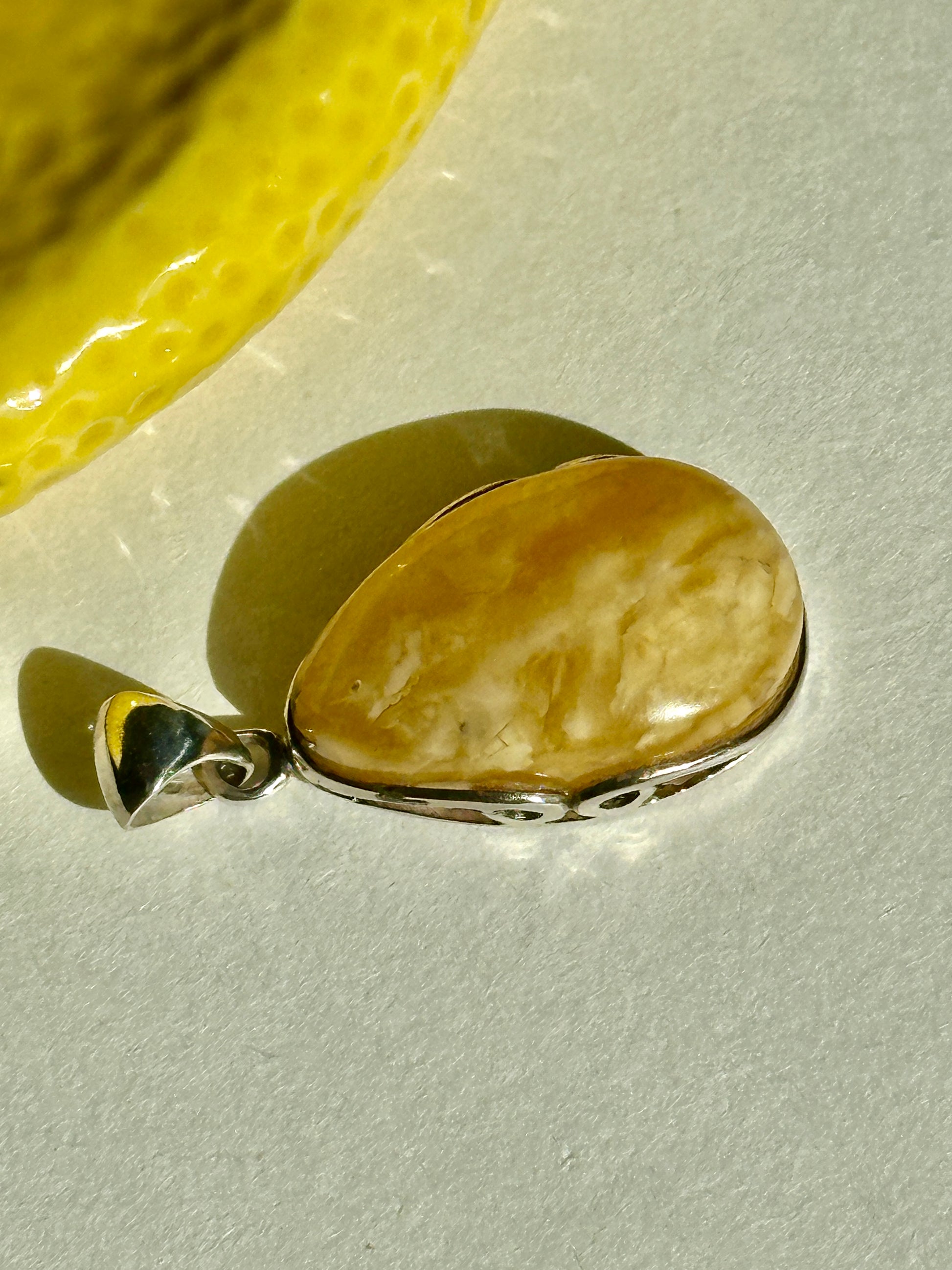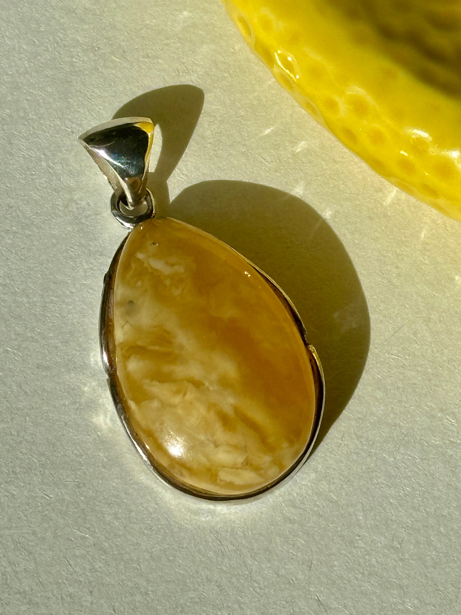 Warm butter yellow – one of 2025’s top colors – meets timeless elegance in this one-of-a-kind amber pendant with sterling silver accents. A unique, classic piece from the Limone collection, inspired by Italian sunsets, seaside homes, and lemon gelato. Each pendant is one of a kind – no two are the same.