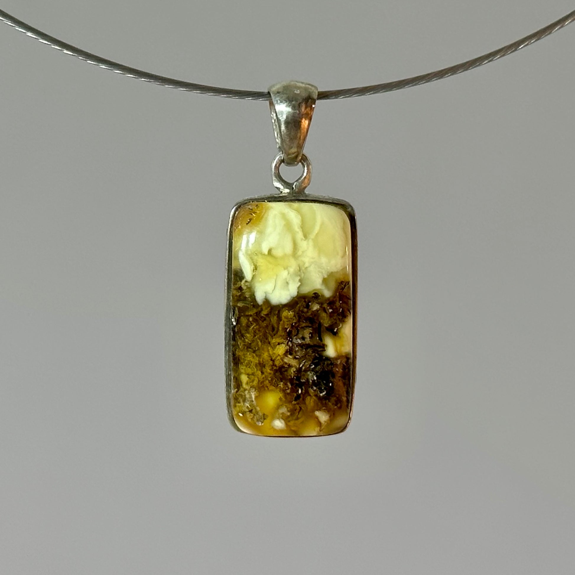 This sleek, rectangle-shaped amber pendant exudes simplicity and understated elegance. Its unisex design is versatile, featuring a beautiful mix of amber hues that flow throughout the stone, creating a rich, dynamic look. With its modest yet captivating style, this pendant is perfect for anyone who appreciates natural beauty and timeless craftsmanship in a minimalist form.