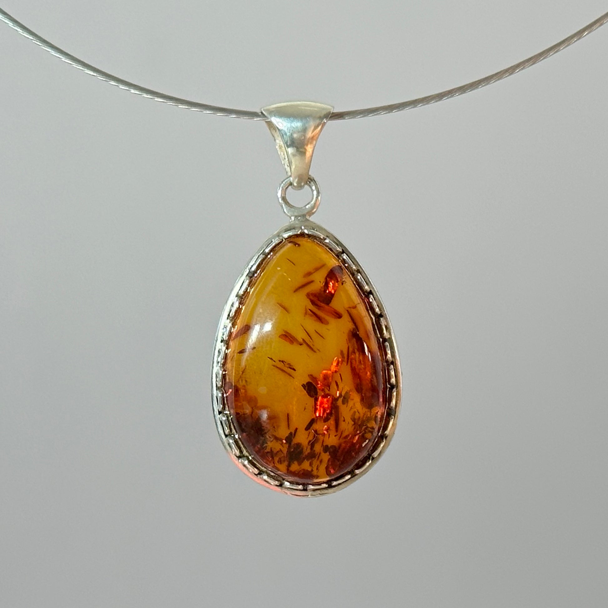 This striking brown amber pendant captures the dynamic essence of fire, with rich red tones that come to life in sunlight. The intricate silver lining around the amber adds a touch of modest elegance, balancing the pendant's fiery intensity. Perfect for those who appreciate bold yet understated beauty, this piece offers a warm and captivating glow, making it a timeless addition to any collection.