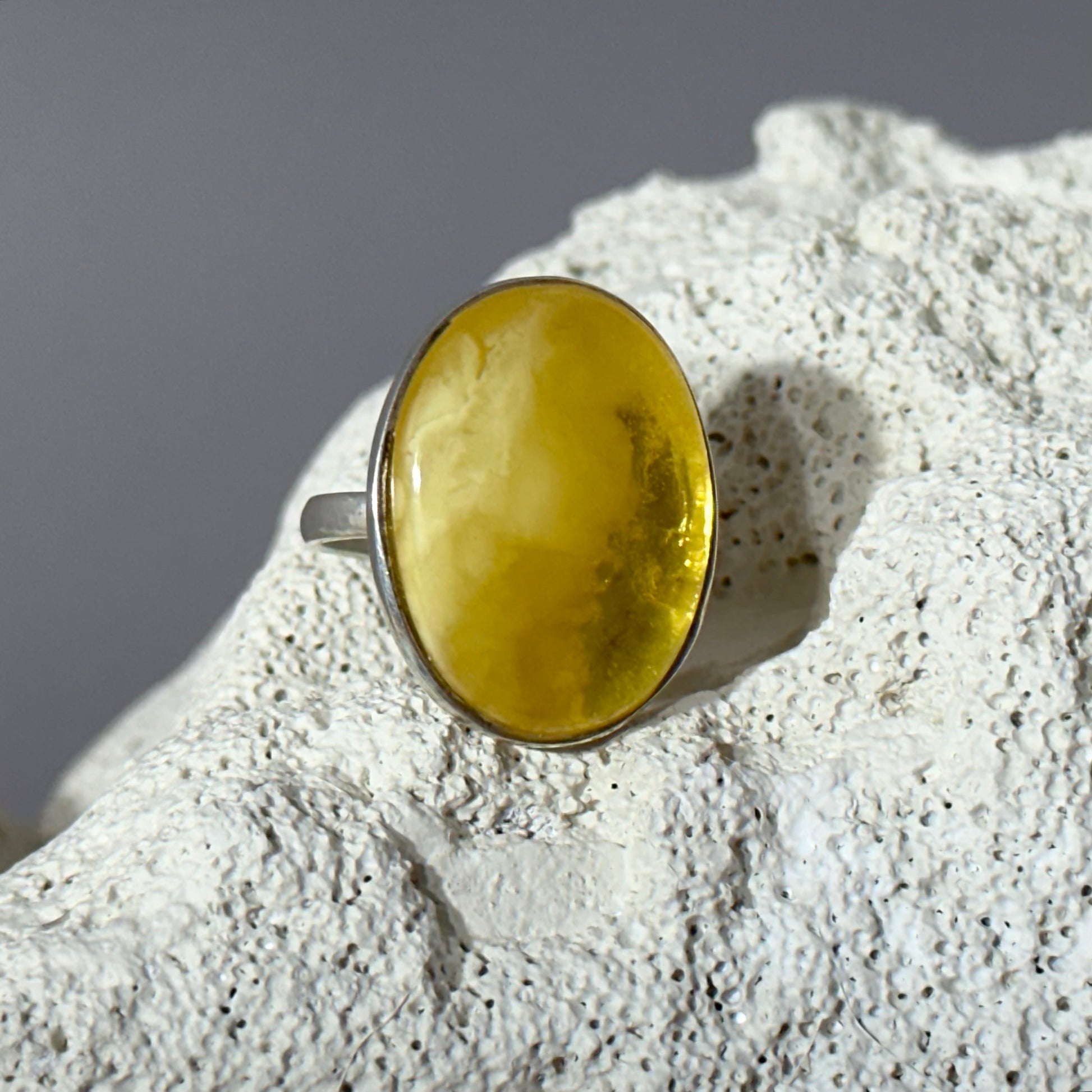 This subtle oval-shaped white amber ring offers a modern and versatile design that effortlessly complements any style. Its clean lines and soft hue make it a timeless piece, perfect for adding a touch of elegance to both casual and formal looks. A truly adaptable accessory for any occasion.