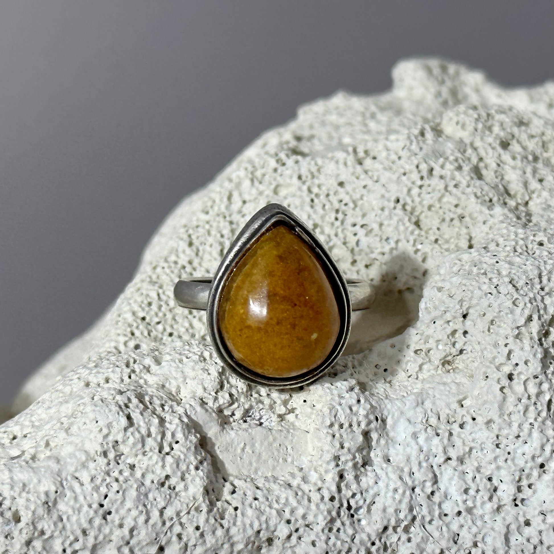 This striking ring features a tear-shaped brown amber stone set in a dark metal band, exuding a minimalist yet powerful aesthetic. Its smooth curves and deep tones evoke the timeless elegance of gothic architecture, making it a bold statement piece for those with a taste for simple, yet powerful style.