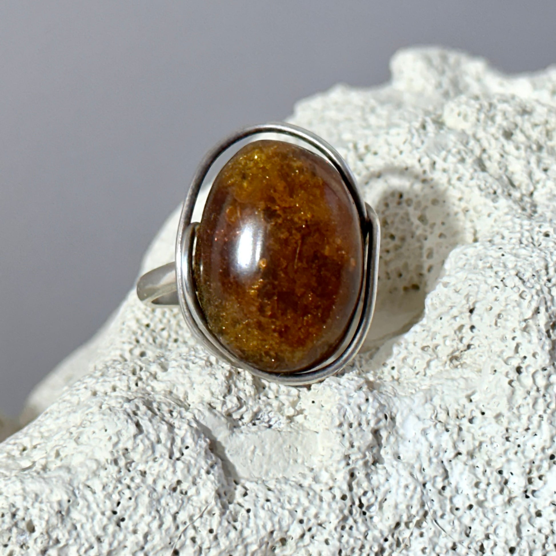 This massive amber ring exudes a mysterious, witchy vibe, due to its bold design and intricate braided silver detailing. The deep amber stone, paired with the textured silver, creates a captivating, almost magical look. Perfect for those who want to channel a sense of mysticism and strength, this statement piece adds an enchanting touch to any outfit.
