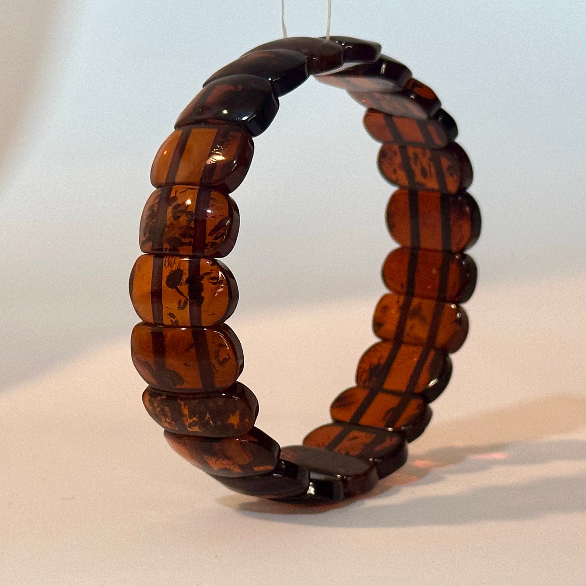 The Slim Cognac Amber Bracelet features finely polished amber stones, radiating a refined and delicate charm. The warm gradient of colors, with a focus on a rich dark cognac tone, creates a sophisticated and harmonious look. Its slim design and perfectly polished finish make it an elegant choice for any occasion, whether as a subtle everyday accessory or a complement to a more formal outfit.