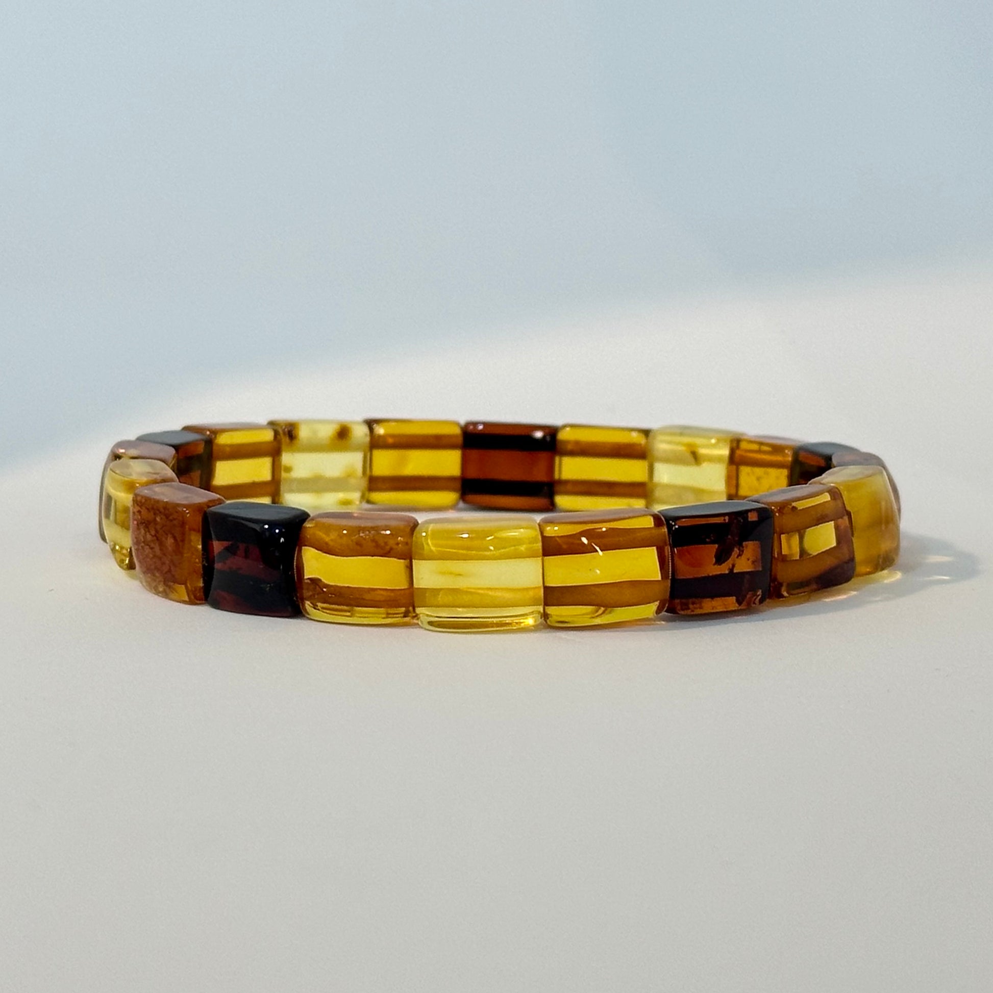 This Multicolor Amber Tennis Bracelet features a delicate, thin design with perfectly cut amber stones in a range of warm, natural hues. Each stone is carefully shaped to maintain a uniform form, creating a sleek and minimalistic look. The soft, multi-colored stones offer a subtle yet elegant touch, making it a versatile accessory for any occasion. With its refined simplicity and timeless appeal, this bracelet is perfect for adding a hint of sophistication to both casual and formal outfits.