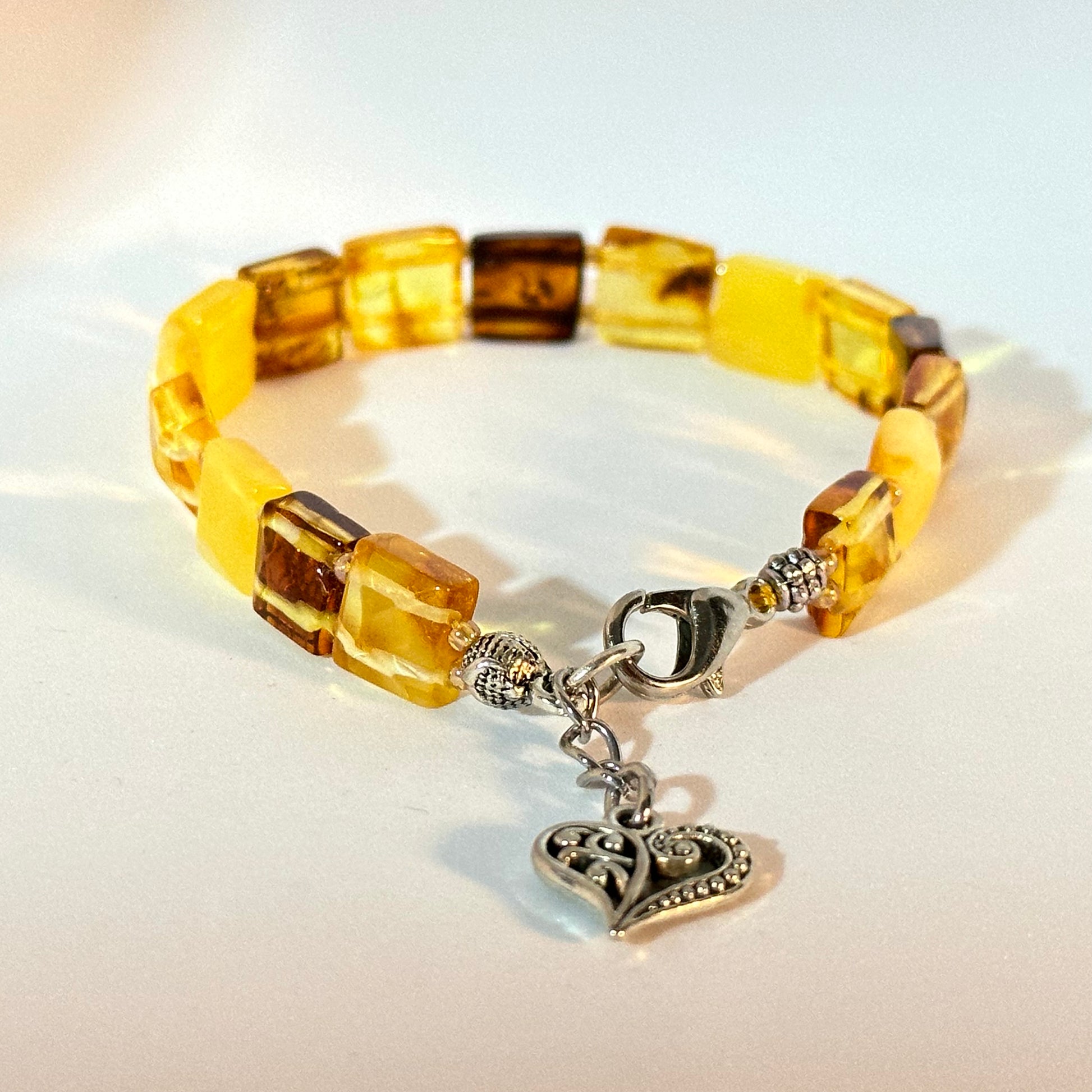The Yellow Amber Heart Tennis Bracelet features a sleek line of vibrant yellow amber stones, exuding warmth and elegance. A delicate heart charm at the clasp adds a special touch, perfect for conveying a meaningful message or symbolizing love and connection. This bracelet combines timeless beauty with a personal sentiment, making it an ideal gift or cherished accessory. Its versatile design ensures it complements any outfit with grace and charm.